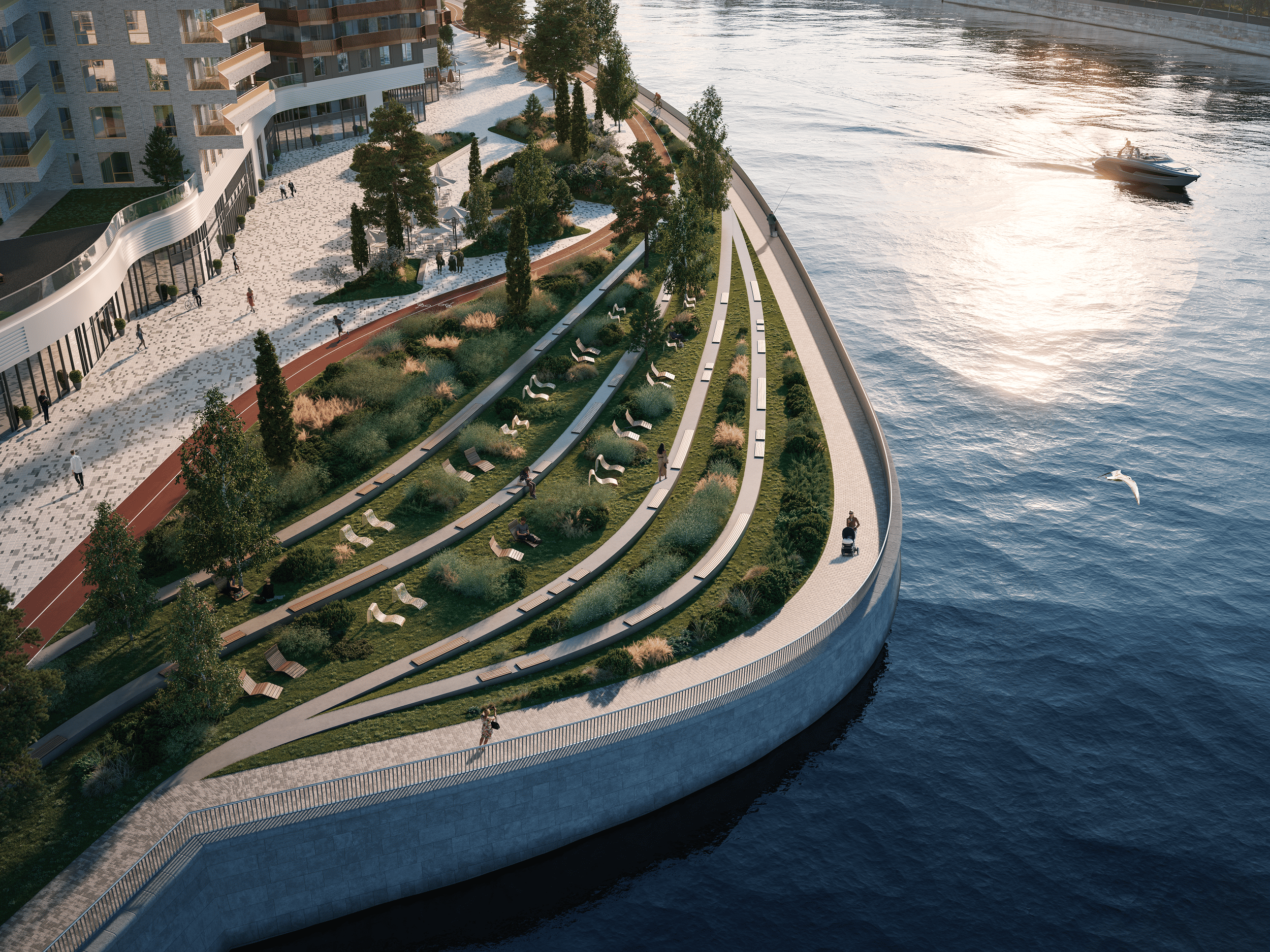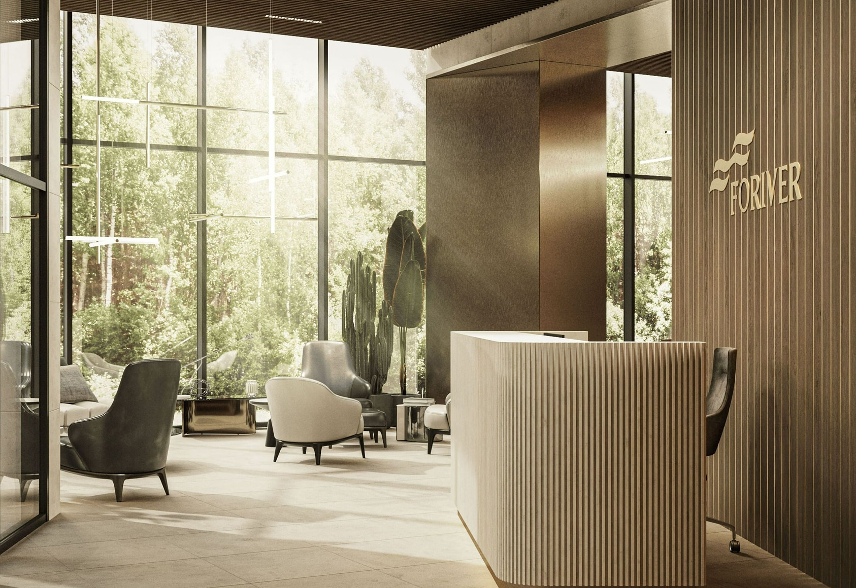 - Фасады акцентных башен на первой береговой линии обыгрывают речные мотивы